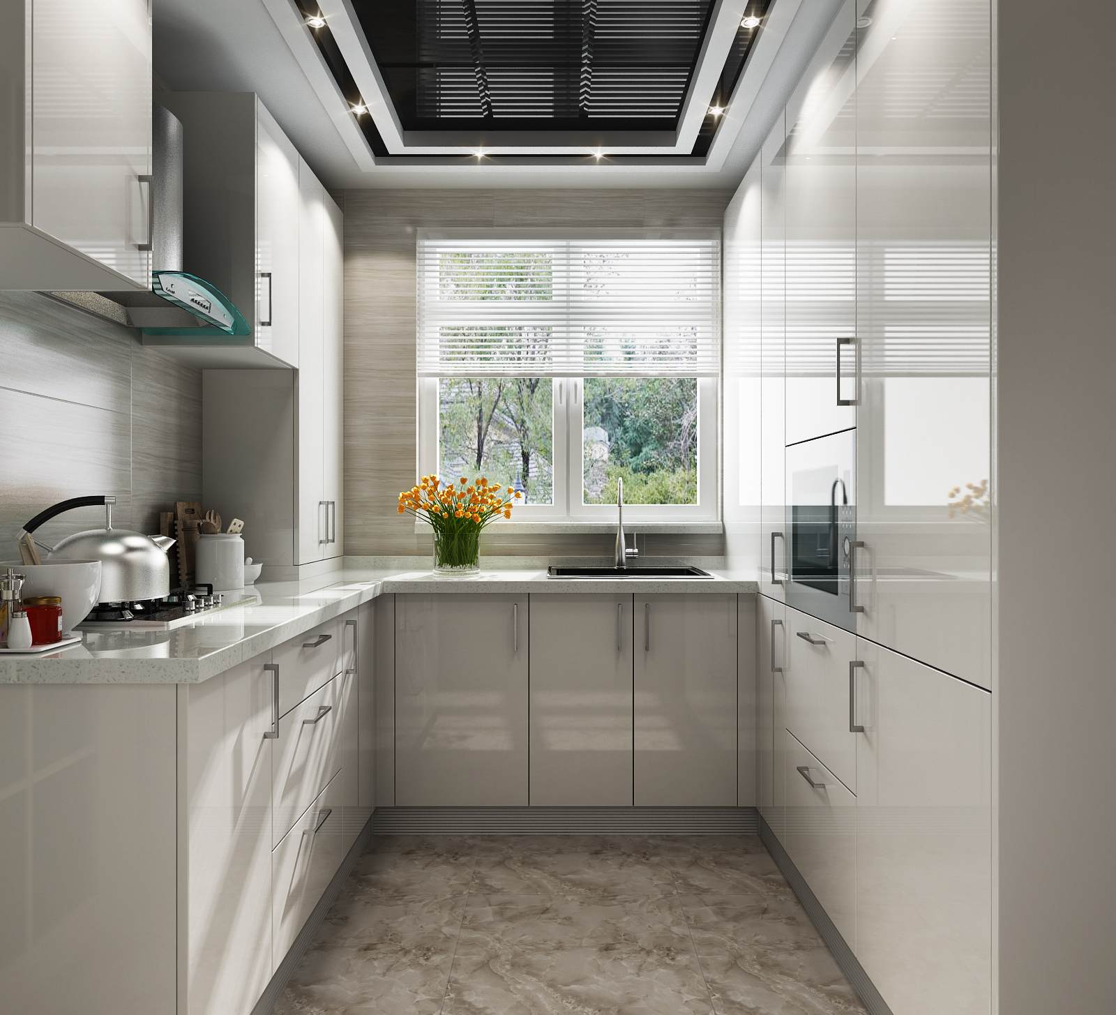 Modern European Style Small Modular Gray Glossy Kitchen Cabinet With White Quartz Countertop